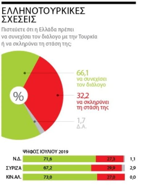Δύο στους τρεις Ελληνες τάσσονται υπέρ του διαλόγου με την Τουρκία, ενώ το 32,2% υποστηρίζει την άποψη ότι η χώρα μας πρέπει να σκληρύνει τη στάση της. Είναι προφανές από το κλίμα που απηχούν τα ευρήματα της δημοσκόπησης ότι οι εικόνες με τη φρίκη του πολέμου στην Ουκρανία που φτάνουν μέσα από τους τηλεοπτικούς δέκτες καθημερινά σε όλα τα ελληνικά νοικοκυριά οδηγεί την πλειονότητα σε διαλλακτικές προσεγγίσεις σε σχέση με την επίλυση των διεθνών διαφορών.