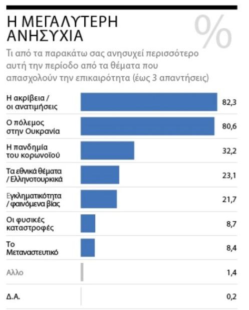 Ενας στους τρεις πολίτες, εξάλλου, θεωρεί ότι η κατάσταση στη χώρα θα ήταν ίδια ανεξάρτητα από το ποιος έχει την ευθύνη της διακυβέρνησης. Σύμφωνα με τις απαντήσεις των πολιτών, περισσότεροι από οκτώ στους δέκα είναι ανήσυχοι για την ακρίβεια και τις ανατιμήσεις στην αγορά (82,3%), ενώ σε αντίστοιχα επίπεδα κυμαίνεται και η ανησυχία για τον πόλεμο (80,6%). Αντιθέτως φαίνεται να υποχωρεί ο προβληματισμός τόσο για την πανδημία (32,2%), που κυριαρχούσε την προηγούμενη διετία και τις εξελίξεις στα Ελληνοτουρκικά (21,7%), που αποτελούν διαχρονική πηγή προβληματισμού.
