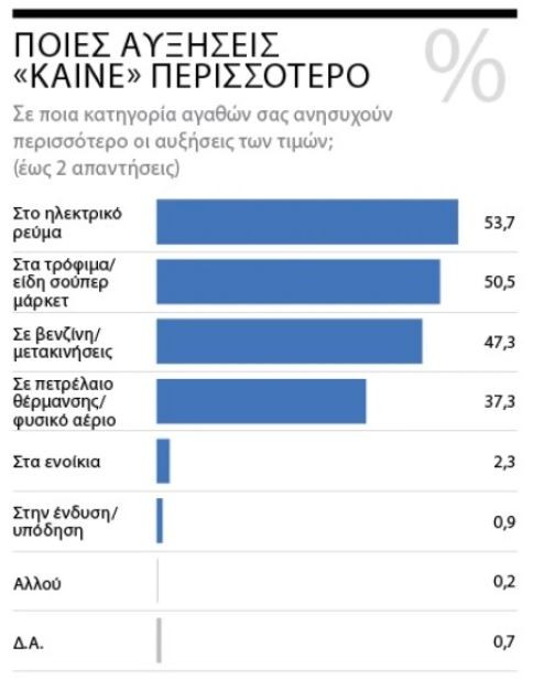 Οι φουσκωμένοι λογαριασμοί του ηλεκτρικού ρεύματος (σε ποσοστό 53,7%), οι αυξημένες δαπάνες για την προμήθεια των τροφίμων (με 50,5%), η ακριβότερη βενζίνη που πληρώνουμε για τις μετακινήσεις (47,3%), καθώς και οι ανατιμήσεις σε πετρέλαιο και σε φυσικό αέριο που χρησιμοποιούμε για τη θέρμανση (37,3%) είναι οι παράγοντες που έχουν βάλει φωτιά στους οικογενειακούς προϋπολογισμούς.