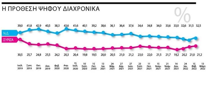 Επιβεβαιώνοντας την τάση που θέλει οι πολίτες σε περιόδους μεγάλων κρίσεων να συσπειρώνονται γύρω από τις ηγεσίες που εγγυώνται σταθερότητα, το κυβερνών κόμμα αυξάνει κατά μία εκατοστιαία μονάδα την επίδοσή του στην πρόθεση ψήφου και διευρύνει ελαφρώς το προβάδισμα που κατέχει σταθερά έναντι της αξιωματικής αντιπολίτευσης και φτάνει στη συγκεκριμένη μέτρηση στις 11,3 μονάδες.