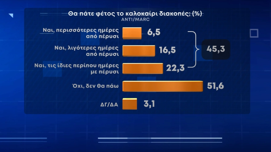 Σημειώνεται ότι το 22,3% δηλώνει ότι θα κάνει διακοπές τις ίδιες περίπου ημέρες με πέρυσι, το 16,5% λιγότερες και μόνον το 6,5% περισσότερες ημέρες από πέρυσι.