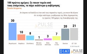 Ενδιαφέρον παρουσιάζει η αποτίμηση των πολιτών για τις 100 πρώτες ημέρες της κυβέρνησης. Στο σύνολο του δείγματος, το 30% συμφωνεί ότι οι καλύτερες επιδόσεις της κυβέρνησης σημειώνονται στα θέματα της φορολογίας. Με σημαντική διαφορά θετικής αποτίμησης έπονται τα θέματα ασφάλειας (10%) και επενδύσεων (8%).