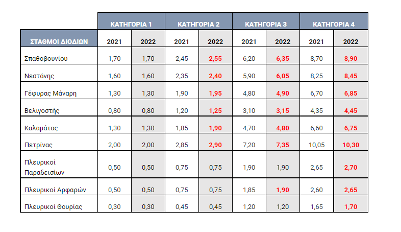 Ο νέος τιμοκατάλογος περιλαμβάνει ΦΠΑ 24% και θα ισχύει για όλους τους μετακινούμενους, συμπεριλαμβανομένων των κατόχων ηλεκτρονικών πομποδεκτών.