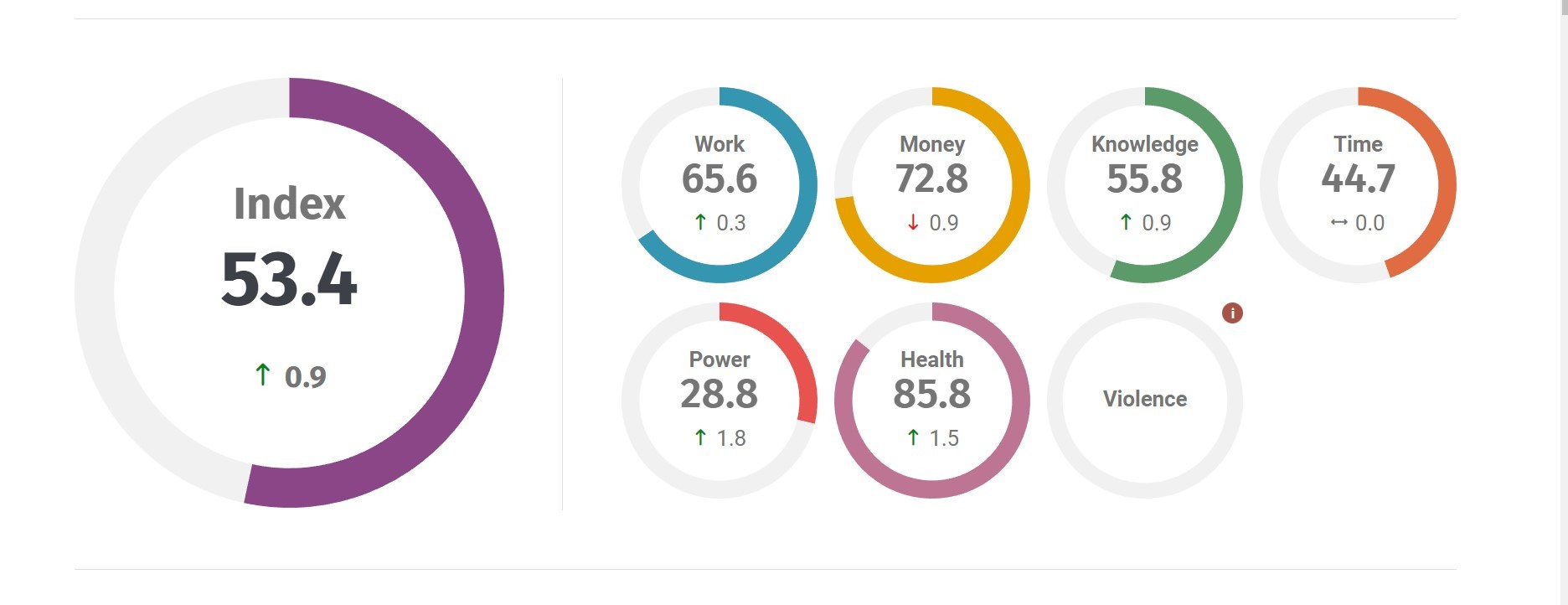 Ο Δείκτης αποκαλύπτει ότι η πρόοδος στην ισότητα των δύο φύλων «συνεχίζεται με ρυθμό σαλιγκαριού», με αύξηση μόλις 0,6 μονάδες σε σχέση με την περσινή έκδοση. Ως αποτέλεσμα, η μέση βαθμολογία της ΕΕ ανέρχεται πλέον σε 68,6 βαθμούς (με μέγιστη δυνατή τιμή τους 100 βαθμούς/ πλήρης ισότητα ανδρών – γυναικών), μόλις 5,5 βαθμούς υψηλότερα από ό,τι το 2010.