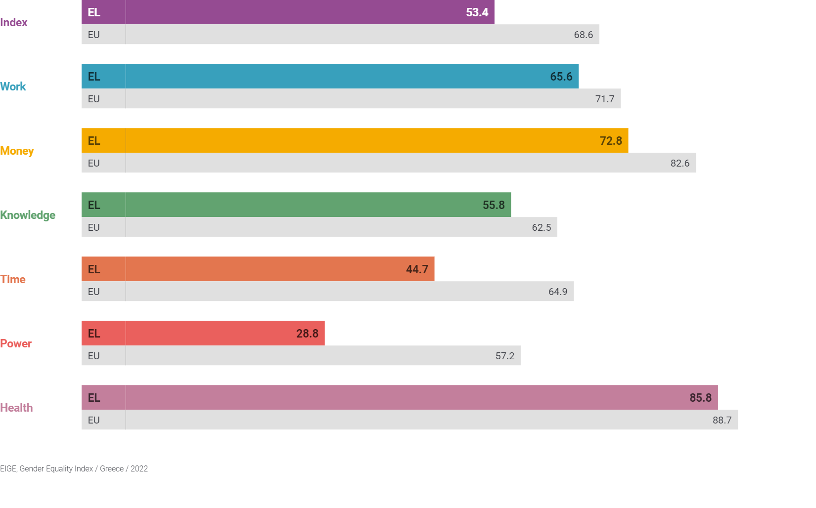 Με 53,4 στις 100 μονάδες, η Ελλάδα βρίσκεται στην τελευταία θέση της ΕΕ στον Δείκτη Ισότητας των Φύλων. Η βαθμολογία της είναι 15,2 μονάδες κάτω από τον ευρωπαϊκό μέσο όρο.