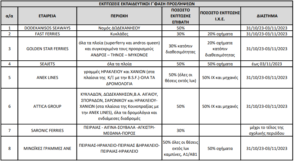 Υπενθυμίζεται ότι με κοινή πρωτοβουλία του Υπουργείου Παιδείας, Θρησκευμάτων και Αθλητισμού και του Υπουργείου Ναυτιλίας και Νησιωτικής Πολιτικής έχουν ανακοινωθεί μειώσεις στα ακτοπλοϊκά εισιτήρια για τους προσληφθέντες τόσο κατά την Α΄ όσο και κατά τη Β΄ φάση αναπληρωτές εκπαιδευτικούς. Τις επόμενες ημέρες ενδέχεται να προστεθούν και άλλες εταιρείες στον ανωτέρω πίνακα, οπότε και θα εκδοθεί νεότερη ενημέρωση.