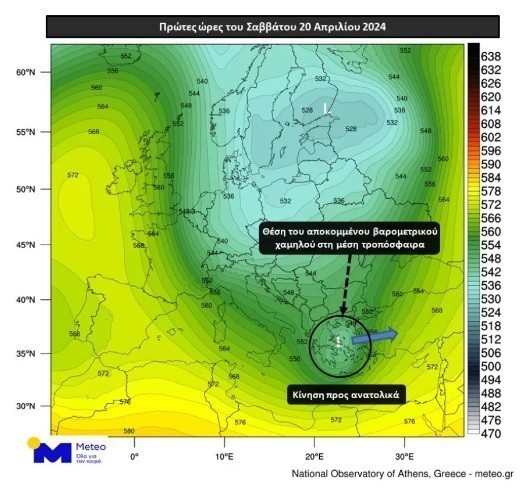 Στον χάρτη που ακολουθεί, παρουσιάζεται η θέση του αποκομμένου βαρομετρικού χαμηλού στη μέση τροπόσφαιρα τις πρώτες ώρες του Σαββάτου 20 Απριλίου.