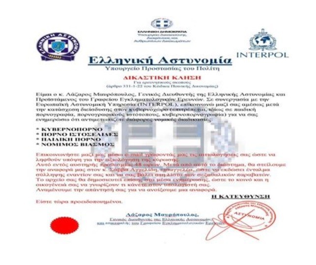 Μάλιστα, χρησιμοποιώντας λογότυπα της Ελληνικής Δημοκρατίας, του Υπουργείου Δικαιοσύνης, του Υπουργείου Προστασίας του Πολίτη, της Ελληνικής Αστυνομίας, της Interpol κ.λπ. και δήθεν υπογραφή του Αρχηγού της Ελληνικής Αστυνομίας, επιχειρούν να προσδώσουν «αληθοφάνεια» στη σχετική επιστολή και να δημιουργήσουν την εντύπωση ότι προέρχεται από την Ελληνική Αστυνομία.