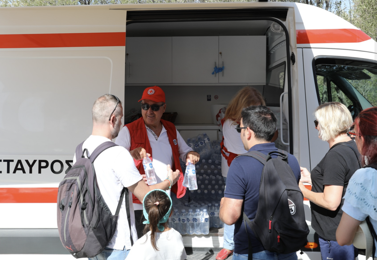 Στην μεγάλη δράση του Ε.Ε.Σ. στην Ακρόπολη παρευρέθη ο Πρόεδρος του Ε.Ε.Σ, Dr. Αντώνιος Αυγερινός. Η δωρεά των χιλιάδων εμφιαλωμένων νερών είναι προσφορά του Ελληνικού Ερυθρού Σταυρού.