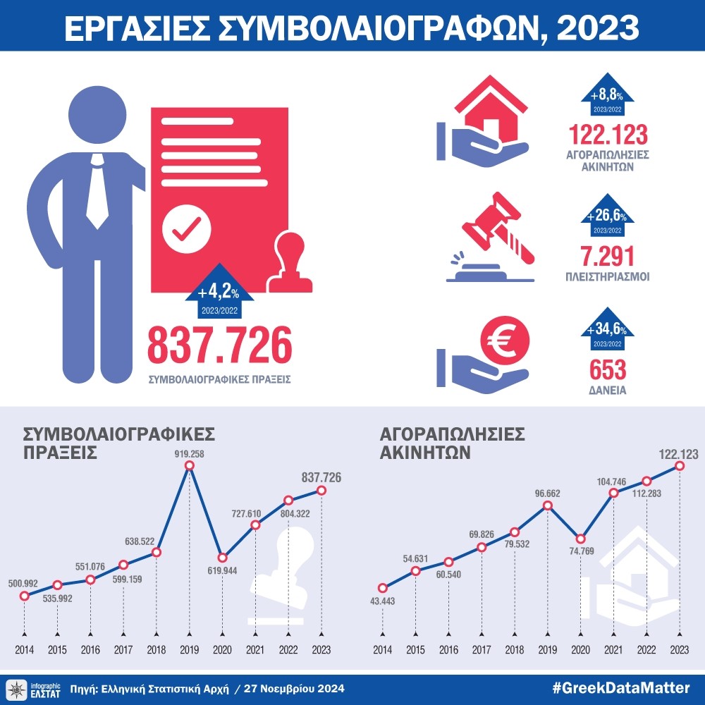Πιο συγκεκριμένα, αυξηση 4,2% σημείωσαν το 2023 οι συμβολαιογραφικές πράξεις στη χώρα μας που ανήλθαν σε 837.726 έναντι 804.322 το 2022, σύμφωνα με την έρευνα της Ελληνικής Στατιστικής Αρχής (ΕΛΣΤΑΤ) ως προς τις εργασίες των συμβολαιογράφων το 2023.