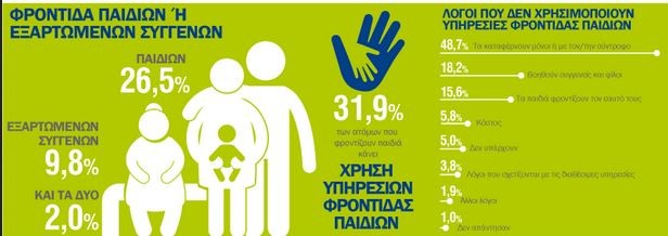 •Οι υπηρεσίες παιδικής φροντίδας αξιοποιούνται από περίπου ένα στα τρία νοικοκυριά, καθώς η φροντίδα των παιδιών πραγματοποιείται κυρίως από τους ερωτηθέντες ή και τους/τις συζύγους/συντρόφους τους. Επίσης, σημαντική είναι η συμβολή από φίλους και συγγενείς (κυρίως παππούδες/γιαγιάδες) .