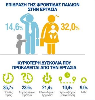 •Το 21,7% των ερωτηθέντων δηλώνει ότι η φροντίδα μικρών παιδιών επηρεάζει την εργασία του, με το ποσοστό για τις γυναίκες να υπερβαίνει το διπλάσιο των ανδρών (32,0% έναντι 14,6%,αντίστοιχα). Για τους άνδρες, οι πιο συχνές συνέπειες αφορούν στην αλλαγή του ωραρίου εργασίας ή σε αλλαγές για την αύξηση του εισοδήματος (π.χ. αυξάνουν τις ώρες εργασίας ή κάνουν κάποια άλλη αλλαγή για να κερδίσουν περισσότερα χρήματα). Οι γυναίκες κυρίως αναφέρουν ότι εργάζονται με μειωμένο ωράριο.