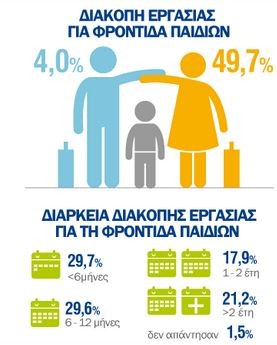 •Η διακοπή της καριέρας για τη φροντίδα των παιδιών αφορά κυρίως στις γυναίκες(49,7%έναντι 4,0% των ανδρών). Επίσης, το 10,9% των γυναικών δεν εργάστηκε για να φροντίσει τα παιδιά του.