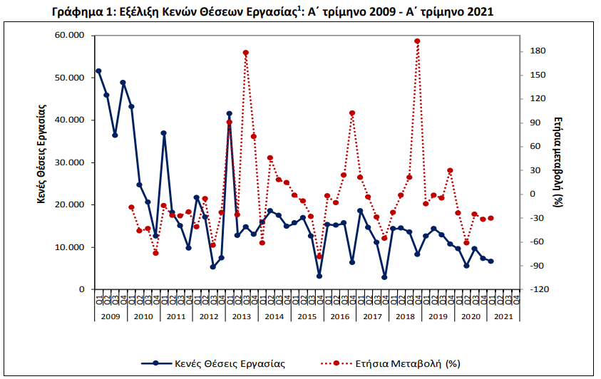 Μείωση 30,5% σημείωσε ο αριθμός των κενών θέσεων εργασίας στο σύνολο της οικονομίας, εκτός από τον πρωτογενή τομέα και τις δραστηριότητες των νοικοκυριών, το α’ τρίμηνο εφέτος σε σύγκριση με το α’ τρίμηνο του 2020 (6.685 θέσεις και 9.617 θέσεις, αντίστοιχα), έναντι μείωσης 23,5% κατά την αντίστοιχη σύγκριση το 2020 προς το 2019.