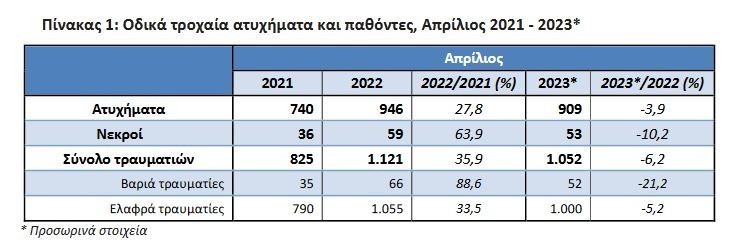 Αναλυτικότερα, σύμφωνα με τα στοιχεία της ΕΛΣΤΑΤ, τα τροχαία τον Απρίλιο, έφτασαν τα 909, έναντι 946 τον Απρίλιο του 2022.