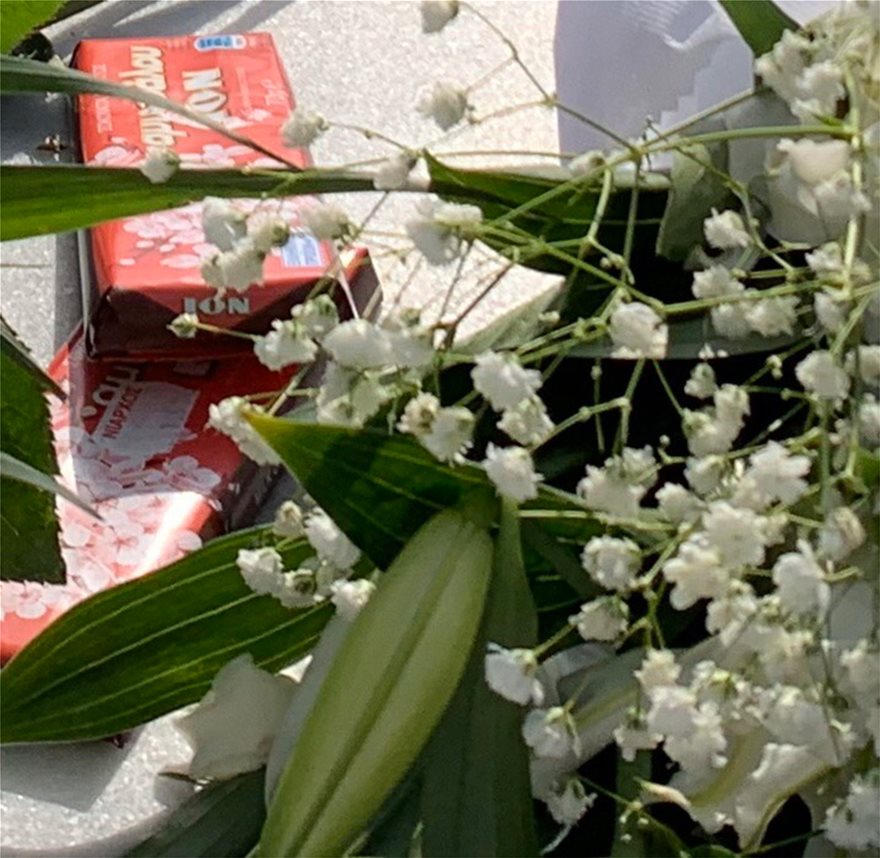 Δυο σοκολάτες αμυγδάλου κέρασμα από χέρια παιδικά,λευκά τριαντάφυλλα, μαύρισε η ζωή μας.