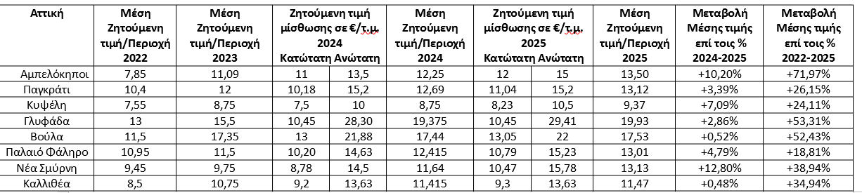 Σύμφωνα με τα στοιχεία που προκύπτουν από τις διαθέσιμες αγγελίες ακινήτων σε περιοχές της Αθήνας με τη μεγαλύτερη ζήτηση από οικογένειες για ενοικίαση κατοικίας, η μέση ζητούμενη τιμή μίσθωσης διαμορφώνεται φέτος στα 12,91€/τ.μ. (12,35€/τ.μ. το 2024, 11,31€/τ.μ. το 2023, 9,8€/τ.μ. το 2022) για διαμέρισμα 80–110 τ.μ., άνω του 1ου ορόφου και κατασκευής μετά το 2000.