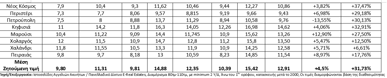 Σύμφωνα με τα στοιχεία που προκύπτουν από τις διαθέσιμες αγγελίες ακινήτων σε περιοχές της Αθήνας με τη μεγαλύτερη ζήτηση από οικογένειες για ενοικίαση κατοικίας, η μέση ζητούμενη τιμή μίσθωσης κυμαίνεται στα 12,35€/τ.μ. ( 11,31€/τ.μ. το 2023, 9,8 €/τ.μ. το 2022) για διαμέρισμα 80τμ-110τμ άνω του 1ου ορόφου, κατασκευής μετά το 2000.