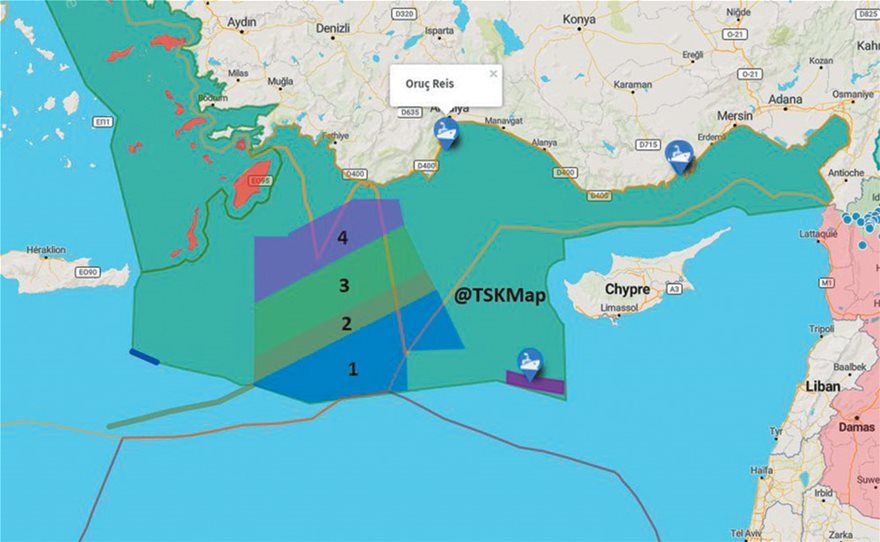 Γράφημα με τον χάρτη αποτυπώνει πλήρως το «γαϊτανάκι» προκλήσεων της Τουρκίας σε περιοχές ελληνικής δικαιοδοσίας από τον Αύγουστο μέχρι σήμερα. Περιοχή (1): NAVTEX 1024/20 (10/8-23/8): Δραστηριότητες του «Oruc Reis» 110 ν.μ. νότια του συμπλέγματος της Μεγίστης. Περιοχή (2): NAVTEX 1062/20 (23/8-27/8): Το «Oruc Reis» κινείται βορειότερα. Περιοχή (3): NAVTEX 1062/20 (27/8-1/9) και NAVTEX 1093/20 (2/9-12/9): Το «Oruc Reis» πλέει ακόμη πιο εγγύς προς το νησιωτικό σύμπλεγμα του Καστελόριζου και τη Ρόδο. Περιοχή (4): NAVTEX 11262/20 (12/10-22/10): Οι δραστηριότητες του «Oruc Reis» καλύπτουν μια περιοχή ακόμη πιο βόρεια από την προηγούμενη NAVTEX, φτάνοντας 6,5 ν.μ. από το Καστελόριζο