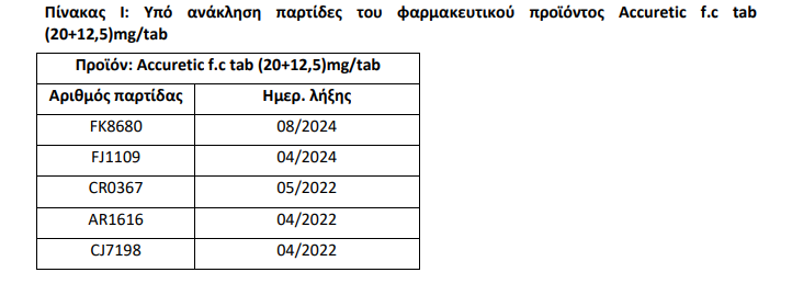 Η ανάκληση αφορά το φάρμακο Accuretic f.c tab (20+12,5)mg/tab και, συγκεκριμένα τις εξής παρτίδες:
