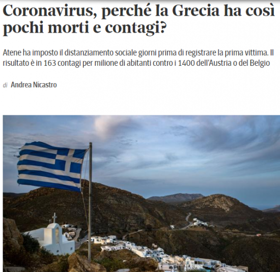 «Γιατί η Ελλάδα έχει τόσο λίγους νεκρούς και κρούσματα;» διερωτάται σε άρθρο της η διαδικτυακή έκδοση της ιταλικής εφημερίδας Corriere della Sera., υπογραμμίζοντας ότι παρά τις περικοπές στο σύστημα υγείας, λόγω της οικονομικής κρίσης, η Ελλάδα είναι μια από τις χώρες που αντέδρασαν καλύτερα στην κρίση του κορονοϊού.