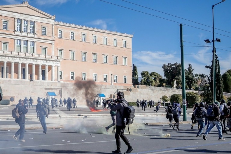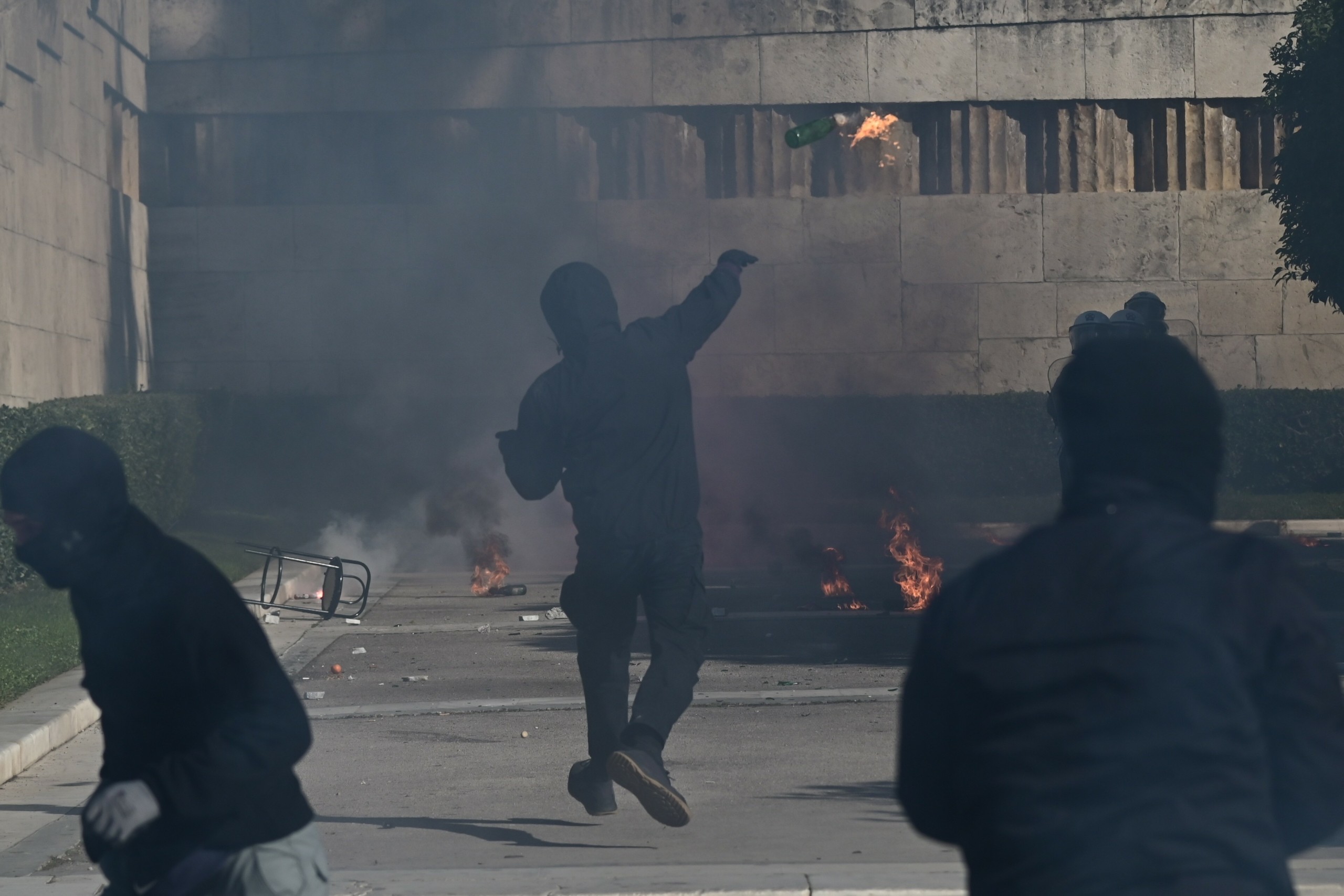 Νωρίτερα σημειώθηκαν επεισόδια και στο Σύνταγμα όπου ομάδα κουκουλοφόρων άρχισε να πετάει μολότοφ μπροστά από τον Άγνωστο Στρατιώτη με τους άνδρες των ΜΑΤ να απαντούν με χρήση χημικών και δακρυγόνα.