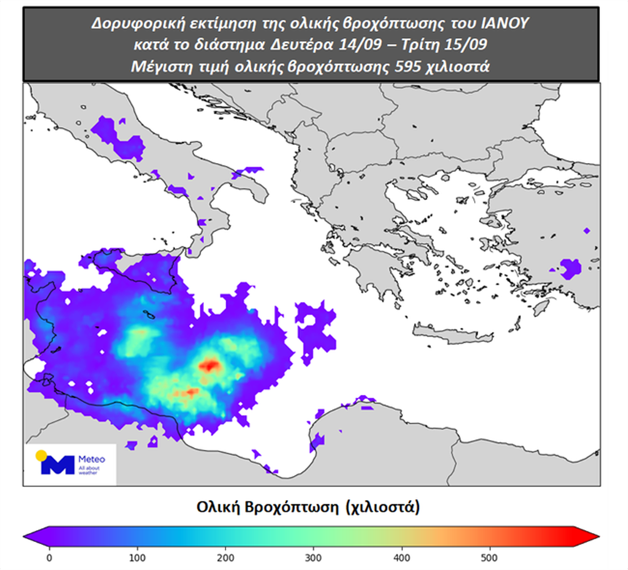 Και συνεχίζει: «Καθώς στροβιλίζεται αυτό το χαμηλό βαρομετρικό γύρω από τον εαυτό του με φορά αντίστροφη από τη φορά κίνησης του δείκτη του ρολογιού, συνδυάζεται με σφοδρότατους ανέμους, όπου οι ριπές θα φτάνουν και τα 12 μποφόρ. Επομένως, μπαίνοντας στην περιοχή των Επτανήσων την Πέμπτη το μεσημέρι προς το απόγευμα, θα έχουμε αυτές τις μέγιστες ριπές στις κεντρικές και νότιες περιοχές των Επτανήσων. Βέβαια, συνοδεία ισχυρών βροχοπτώσεων, καταιγίδων, τοπικών χαλαζοπτώσεων και γενικά έντονων φαινομένων στις περιοχές αυτές».