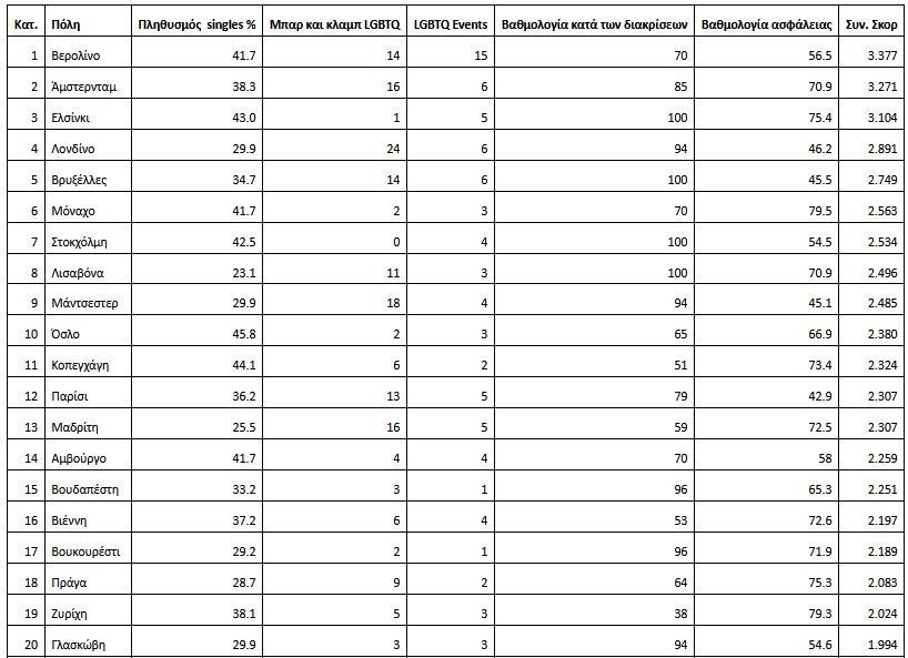 Την πρώτη πεντάδα συμπληρώνουν το Ελσίνκι, το Λονδίνο και οι Βρυξέλλες τα οποία είναι γνωστά για τις κουλτούρες αποδοχής με μερικές από τις καλύτερες βαθμολογίες κατά των διακρίσεων στη λίστα. Το Λονδίνο διαθέτει τα περισσότερα ΛΟΑΤΚΙ+ κλαμπ από τις χώρες που αναλύθηκαν με 27 γκέι κλαμπ και μπαρ σε όλη την πόλη, και αυτό χωρίς να υπολογίζονται οι συναρπαστικές βραδιές κλαμπ σε όλη την πόλη.
