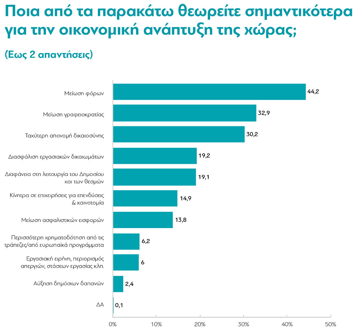 Η πλειοψηφία των Ελλήνων εξακολουθούν να προτιμούν χαμηλή φορολογία έναντι ενός ισχυρού κράτους πρόνοιας –κι αυτό είναι κάτι που ισχύει σε όλες τις έρευνες που έχουμε κάνει από τον Νοέμβριο του 2015 και μετά. Παράλληλα, βέβαια, αξίζει να θυμηθούμε πως όταν στο πρώτο μέρος αυτής της έρευνας, την ίδια περίοδο, ρωτήσαμε “ποια από τις παρακάτω χώρες έχει το καλύτερο μοντέλο διακυβέρνησης”, οι μισοί Έλληνες (49,9%) επέλεξαν την απάντηση “η Σουηδία“. Μια χώρα με πολύ υψηλή φορολογία και ισχυρό κράτος πρόνοιας ήταν η πρώτη τους επιλογή, με πολύ μεγάλη διαφορά από τις επόμενες. - Κατά τα άλλα, οι πολίτες θεωρούν ότι οι τρεις σημαντικότεροι παράγοντες που επηρεάζουν την οικονομική ανάπτυξη είναι κατά σειρά η μείωση της φορολογίας, η μείωση της γραφειοκρατίας και η ταχύτερη απονομή της δικαιοσύνης. Είναι ένα ενδιαφέρον εύρημα -αν μάλιστα αναλογιστούμε και το ότι μόνο 2,4% των ερωτηθέντων αναφέρει ως σημαντική για την ανάπτυξη την “αύξηση των δημόσιων δαπανών”.
