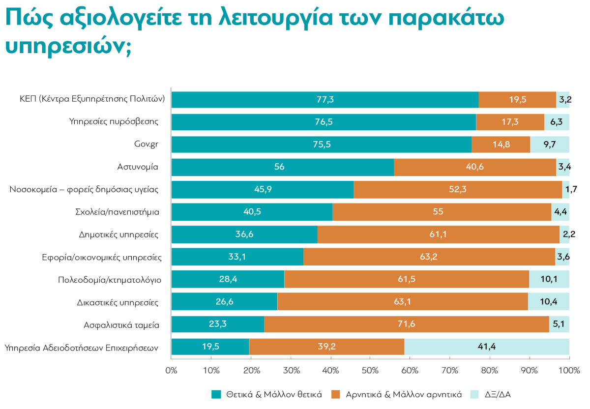 Στη συνέχεια ζητήσαμε από τους Έλληνες να αξιολογήσουν δώδεκα από τις υπηρεσίες που προσφέρει το κράτος στους πολίτες. Ίσως ήταν αναμενόμενο το ότι έχουν θετική άποψη μόνο για λίγες από αυτές: συγκεκριμένα, αξιολογούν “θετικά” ή “μάλλον θετικά” μόνο τέσσερις. Τη μία από αυτές με μικρή πλειοψηφία θετικών απόψεων (η αστυνομία, με 56% θετικές γνώμες) και άλλες τρεις με πολύ μεγάλες (πάνω από 75%): το gov.gr, την πυροσβεστική και τα ΚΕΠ.