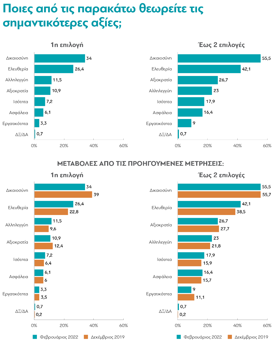 Το 2022 οι Έλληνες θεωρούν σημαντικότερη αξία τη “δικαιοσύνη” (34%), την οποία εξακολουθούν να επιλέγουν περισσότεροι από όσοι επιλέγουν την “ελευθερία” (26,4%), με την αξιοκρατία και την αλληλεγγύη να ακολουθούν. Στις νεότερες ηλικίες, πάντως, ισχύει το ανάποδο.
