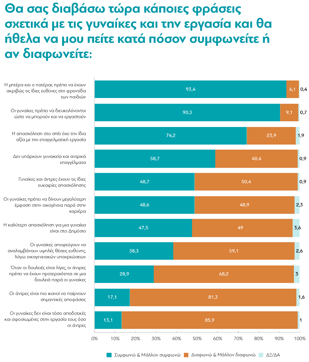 Πάντως, το 93,4% του πληθυσμού συμφωνούν ότι “η μητέρα και ο πατέρας πρέπει να έχουν ακριβώς τις ίδιες ευθύνες στη φροντίδα των παιδιών”.