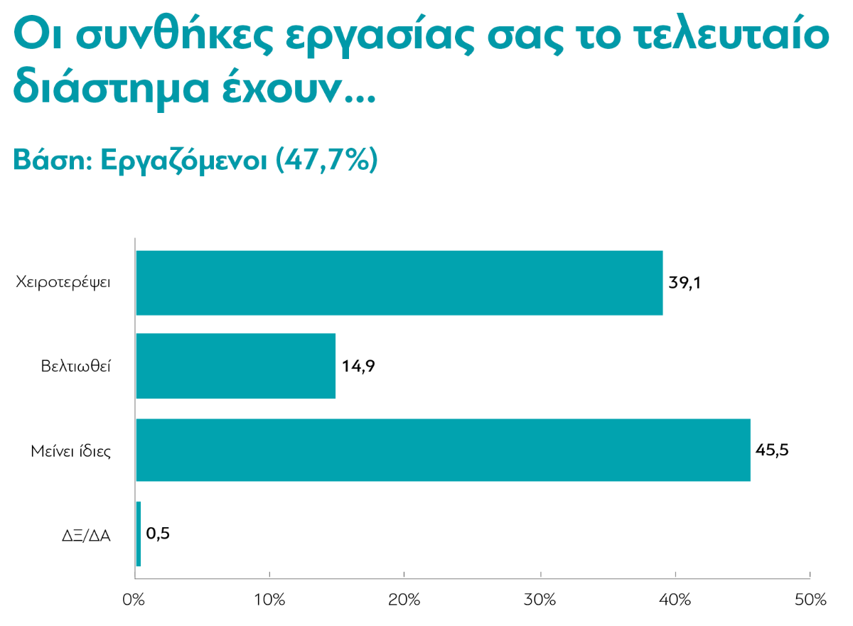 - Και πώς άλλαξε η εργασιακή κατάσταση των Ελλήνων κατά την περίοδο της πανδημίας; Το 39,1% των εργαζομένων δήλωσαν ότι οι συνθήκες εργασίας τους το τελευταίο διάστημα “έχουν χειροτερέψει”.