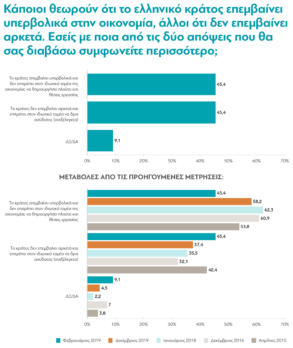 - Τον Δεκέμβριο του 2019 σχεδόν 6 στους 10 Έλληνες (58,2%) συμφωνούσαν πως “το κράτος επεμβαίνει υπερβολικά και δεν επιτρέπει στον ιδιωτικό τομέα της οικονομίας να δημιουργήσει πλούτο και θέσεις εργασίας”, ενώ περίπου 1 στους 3 (37,4%) είχε την άποψη πως “το κράτος δεν επεμβαίνει αρκετά και επιτρέπει στον ιδιωτικό τομέα να δρα ανεξέλεγκτα”.