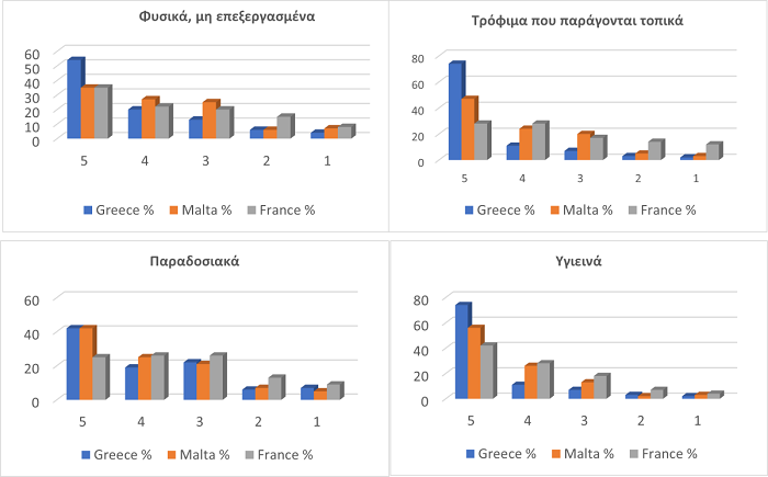 * Και στις τρεις χώρες οι καταναλωτές όταν αγοράζουν προϊόντα διατροφής, δίνουν ιδιαίτερα βαρύτητα στη «φυσικότητα» των τροφίμων, καθώς τα θεωρούν πιο υγιεινά, ενώ ακολουθούν με σημαντικά ποσοστά προτίμησης τα παραδοσιακά τρόφιμα και αυτά που παράγονται τοπικά. Ειδικά στην Ελλάδα, οι συμμετέχοντες εμφανίζονται να αξιολογούν με ιδιαίτερα μεγάλα ποσοστά αυτά τα χαρακτηριστικά.