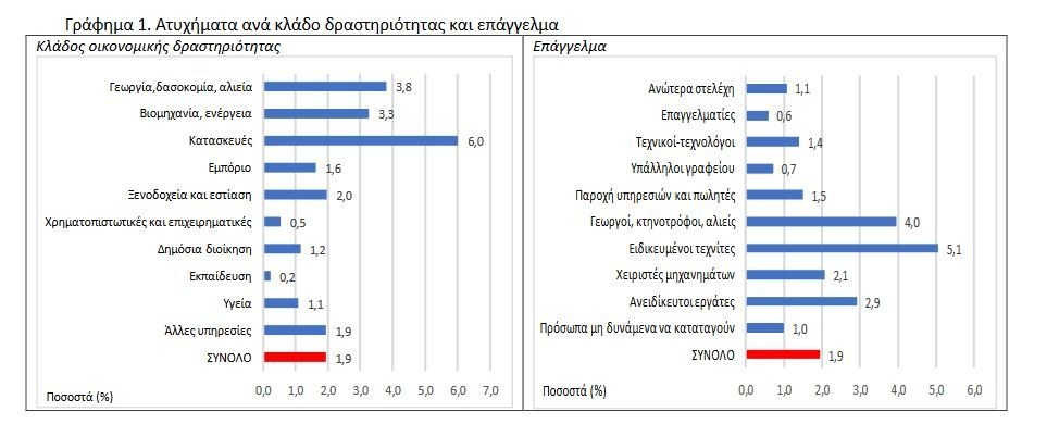 Σύμφωνα με την ειδική έρευνα της ΕΛΣΤΑΤ, οι κλάδοι με το υψηλότερο ποσοστό ατυχημάτων στην εργασία αφορούν στην πρωτογενή και τη δευτερογενή παραγωγή. Το υψηλότερο ποσοστό απαντάται στις κατασκευές (6%) ενώ ακολουθούν η γεωργία, δασοκομία και αλιεία (3,8%) και η βιομηχανία και ενέργεια (3,3%). Οι κλάδοι με τα χαμηλότερα ποσοστά ατυχημάτων είναι η εκπαίδευση (0,2%) και οι χρηματοπιστωτικές και επιχειρηματικές δραστηριότητες (0,5%).
