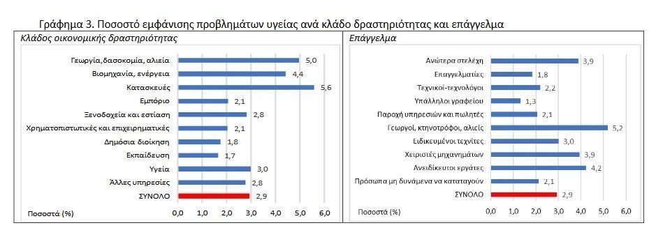 Οι κλάδοι με το μεγαλύτερο ποσοστό εμφάνισης προβλημάτων υγείας αφορούν στην πρωτογενή και στη δευτερογενή παραγωγή. Το υψηλότερο ποσοστό συναντάται στις κατασκευές (5,6%) ενώ ακολουθούν η γεωργία, δασοκομία και αλιεία (5%), και η βιομηχανία και ενέργεια (4,4%). Αντίθετα, το χαμηλότερο ποσοστό εμφάνισης προβλημάτων υγείας εμφανίζονται στην εκπαίδευση και τη δημόσια διοίκηση (1,7% και 1,8%, αντίστοιχα). Οι επαγγελματικές ομάδες που υποφέρουν περισσότερο από προβλήματα υγείας που σχετίζονται με την εργασία είναι οι γεωργοί, κτηνοτρόφοι και αλιείς, και οι ανειδίκευτοι εργάτες, χειρώνακτες και μικροεπαγγελματίες (5,2% και 4,2% αντίστοιχα). Αντιθέτως, το χαμηλότερο ποσοστό εμφάνισης προβλημάτων υγείας εμφανίζεται στους υπαλλήλους γραφείου και στους επαγγελματίες (1,3% και 1,8%, αντίστοιχα).