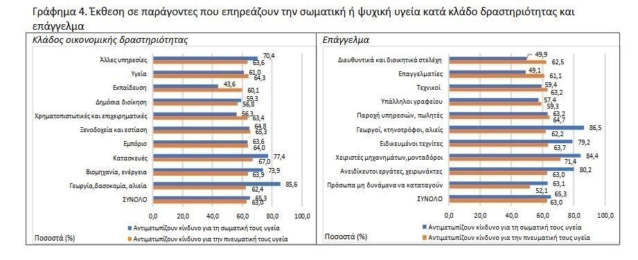 Οι κλάδοι δραστηριότητας με τη μεγαλύτερη έκθεση σε παράγοντες κινδύνου για την σωματική υγεία είναι η γεωργία, δασοκομία, αλιεία (85,6%), οι κατασκευές (77,4%) και η βιομηχανία και ενέργεια (73,9%). Οι κλάδοι με τη μεγαλύτερη έκθεση σε παράγοντες κινδύνου για την ψυχική υγεία είναι οι κατασκευές (67%), τα ξενοδοχεία και εστίαση (65,3%) και η υγεία (64,3%). Οι επαγγελματικές ομάδες με τη μεγαλύτερη έκθεση σε παράγοντες κινδύνου για τη σωματική υγεία είναι οι γεωργοί, κτηνοτρόφοι, και αλιείς (86,5%) και οι χειριστές μηχανημάτων (84,4%). Οι τελευταίοι δηλώνουν, επίσης, και τα μεγαλύτερα ποσοστά κινδύνου και στην πνευματική τους υγεία (71,4%), ακολουθούμενοι από τους απασχολούμενους στην παροχή υπηρεσιών και πωλητές (64,7%).