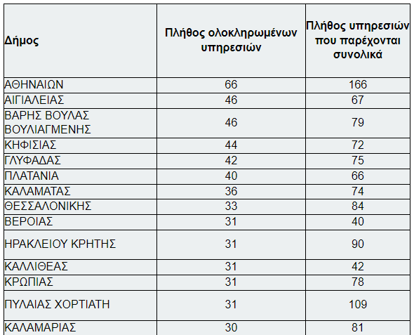 Ο Δήμος Αθηναίων παρέχει τις περισσότερες σε απόλυτο αριθμό υπηρεσίες (166) και ταυτόχρονα -σε σχέση με το σύνολο των 552 υπηρεσιών- εμφανίζει το μεγαλύτερο ποσοστό ολοκληρωμένων ψηφιακών υπηρεσιών.
