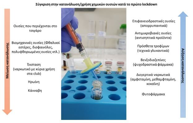 Στην εργασία εξετάστηκαν λύματα προ κορωνοϊού και λύματα κατά τη διάρκεια του πρώτου lockdown από το κέντρο επεξεργασίας λυμάτων της Ψυττάλειας. Τα δείγματα διερευνήθηκαν για χιλιάδες οργανικούς χημικούς ρύπους χρησιμοποιώντας εξελιγμένα αναλυτικά όργανα και υπολογιστικά εργαλεία.