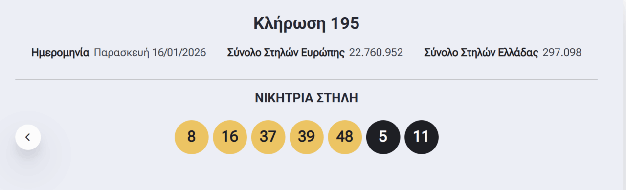Οι τυχεροί αριθμοί που ανέδειξε η κλήρωση του Eurojackpot το βράδυ της Παρασκευής, 16/1/2025 είναι οι εξής: 8, 16, 37, 39, 48 και 5, 11.