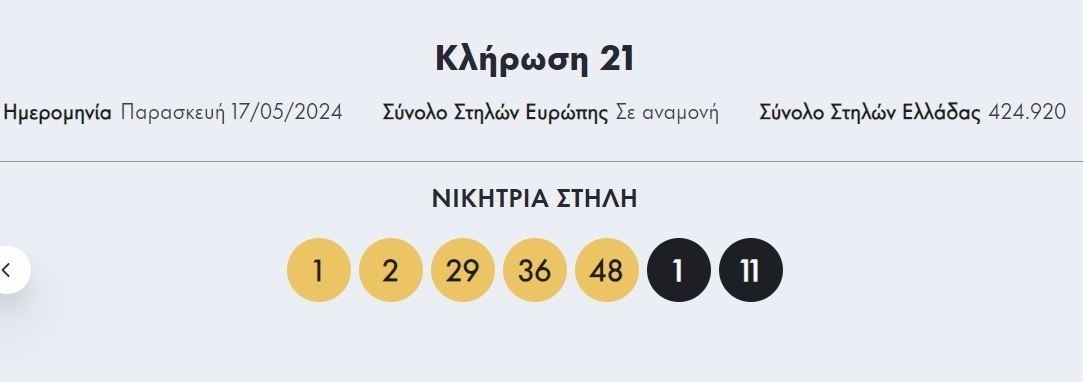 Οι τυχεροί αριθμοί που ανέδειξε η κλήρωση του Eurojackpot το βράδυ της Παρασκευής 17/5/2024 είναι οι εξής:
