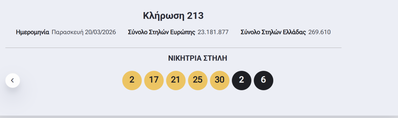 Οι τυχεροί αριθμοί που ανέδειξε η κλήρωση του Eurojackpot το βράδυ της Παρασκευής, 20/3/2026 είναι οι εξής: 2, 17, 21, 25, 30 και 2, 6
