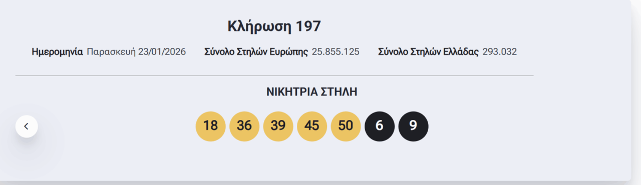 Οι τυχεροί αριθμοί που ανέδειξε η κλήρωση του Eurojackpot το βράδυ της Παρασκευής, 23/1/2026 είναι οι εξής: 18, 36, 39, 45, 50 και 6, 9.