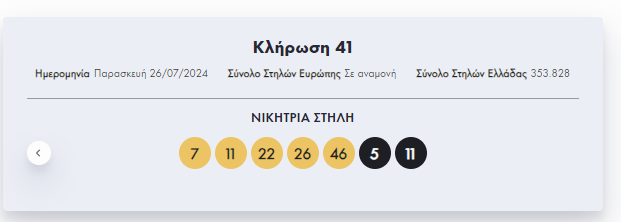 Οι τυχεροί αριθμοί που ανέδειξε η κλήρωση του Eurojackpot το βράδυ της Παρασκευής 26/7/2024 είναι οι εξής: 7, 11, 22, 26, 46, 5, 11