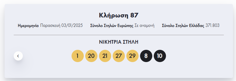 Οι τυχεροί αριθμοί που ανέδειξε η κλήρωση του Eurojackpot το βράδυ της Παρασκευής 3/1/2025 είναι οι εξής: 1, 20, 21, 27, 29, 8, 10