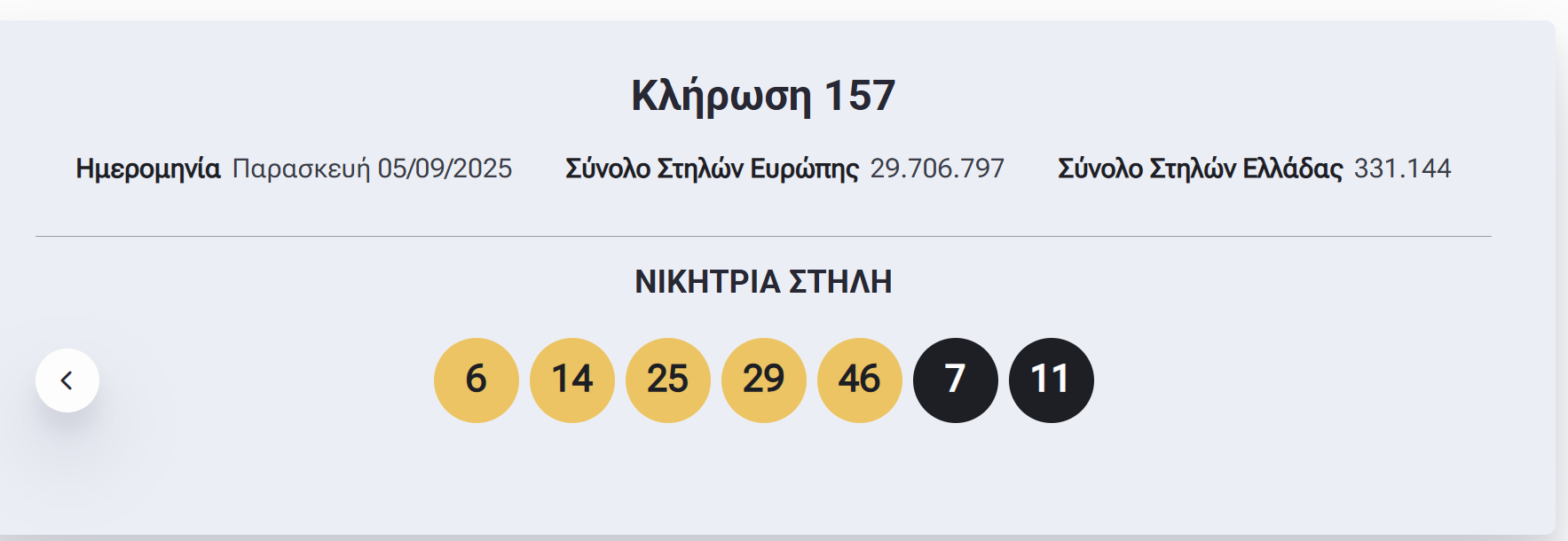 Οι τυχεροί αριθμοί που ανέδειξε η κλήρωση του Eurojackpot το βράδυ της Παρασκευής, 5/9/2025 είναι οι εξής: 6, 14, 25, 29, 46 και 7, 11.