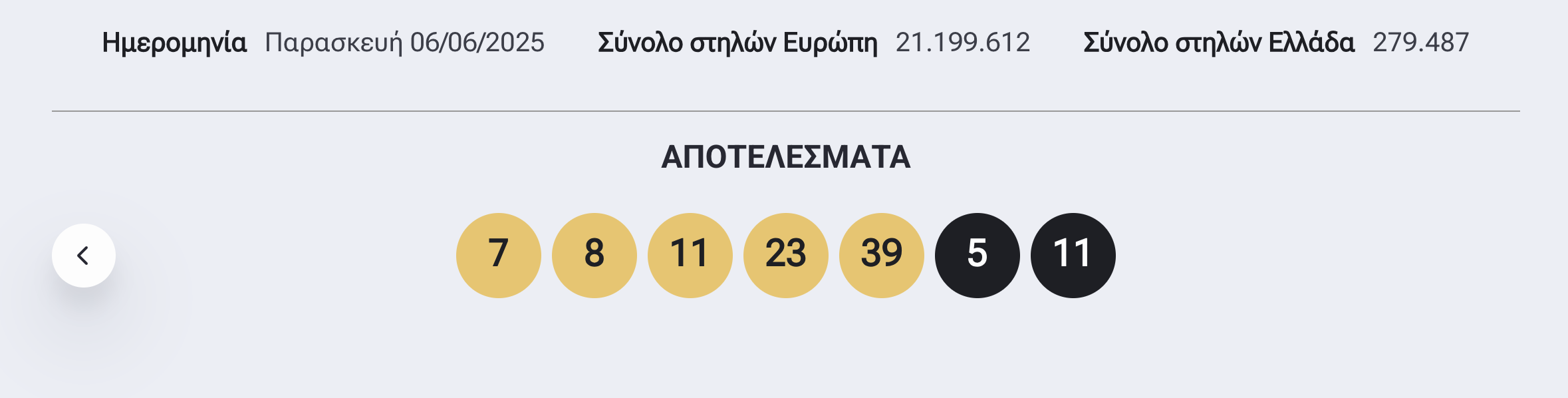Οι τυχεροί αριθμοί που ανέδειξε η κλήρωση του Eurojackpot το βράδυ της Παρασκευής, 6/6/2025 είναι οι εξής: 7, 8, 11, 23, 39 και 5, 11.