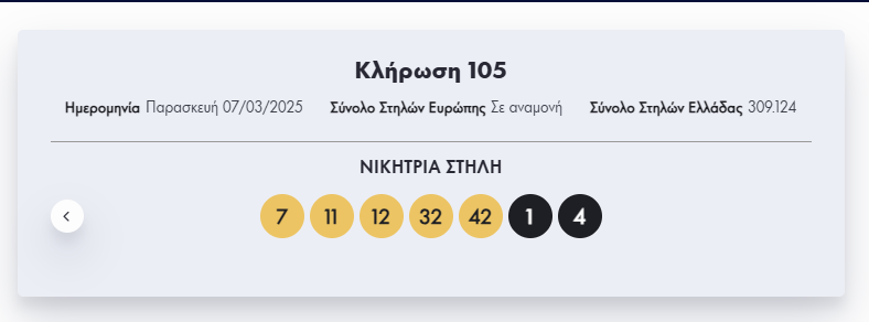 Οι τυχεροί αριθμοί που ανέδειξε η κλήρωση του Eurojackpot το βράδυ της Παρασκευής, 7/3/2025 είναι οι εξής: 7, 11, 12, 32, 42 και 1, 4.