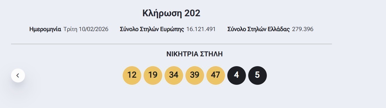 Οι τυχεροί αριθμοί που ανέδειξε η κλήρωση του Eurojackpot το βράδυ της Τρίτης, 10/2/2026 είναι οι εξής: 12, 19, 34, 39, 47 και 4, 5.